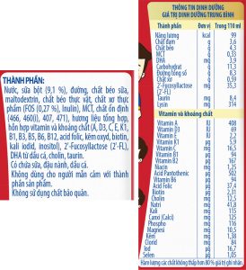 – Hấp thu tốt, hỗ trợ cân nặng: Bổ sung chất béo dễ hấp thu và chuyển hóa nhanh MCT. Sắt và Kẽm giúp trẻ ăn ngon miệng, hỗ trợ tăng cân. Tăng cường Lysin giúp cải thiện dinh dưỡng và cân nặng ở trẻ.