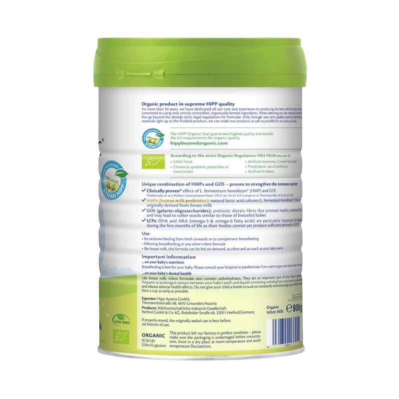 – Nguyên liệu đạt chuẩn Organic Châu Âu: Sữa bột HiPP Organic có bảng thành phần nguyên liệu hoàn toàn hữu cơ, đảm bảo các tiêu chí an toàn: không sử dụng thực phẩm biến đổi gen (GMOs), không chứa thuốc kháng sinh, không sử dụng thuốc trừ sâu tổng hợp hóa học, không dùng phân bón hóa học và nói không với hormone tăng trưởng.