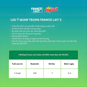 – Hỗ trợ bé ăn ngon miệng, cân nặng: Hàm lượng Protein hợp lý trong France Lait 3 là 2g/100ml, với tỷ lệ Casein/Đạm Whey của France Lait 3 là 60:40, kết hợp cùng Mg, B6,… giúp bé ăn ngon miệng để đạt mức cân nặng lý tưởng.