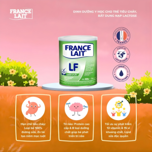 Sữa Pháp France Lait LF 400g – Dành Cho Bé Có Vấn Đề Về Tiêu Hóa như là Tiêu chảy hay Bất dung nạp Lactose. Thành phần sữa không chứa Lactose, giúp bé dễ dàng hấp thụ, bổ sung khoáng dưỡng chất giúp trẻ khỏe mạnh, tăng trưởng toàn diện, cải thiện hệ miễn dịch còn non nớt ở trẻ sơ sinh.