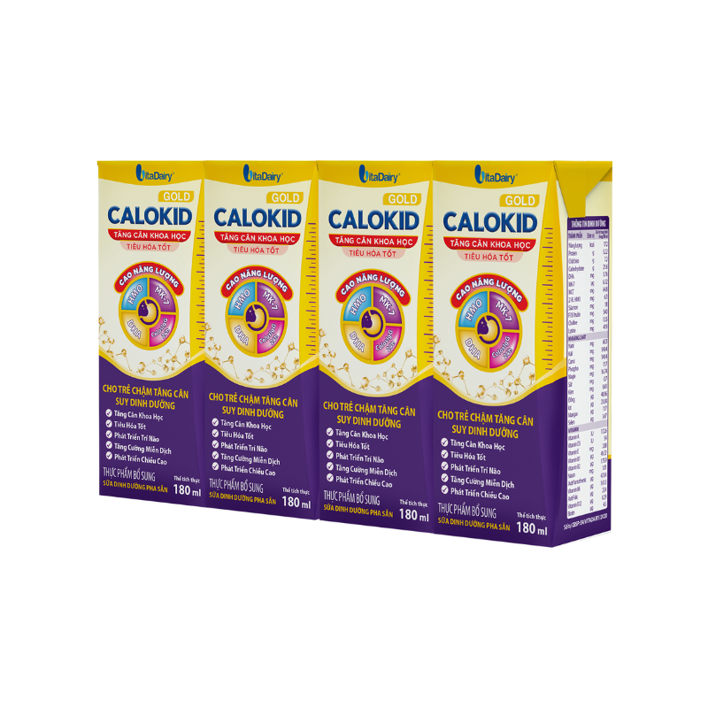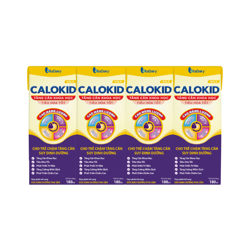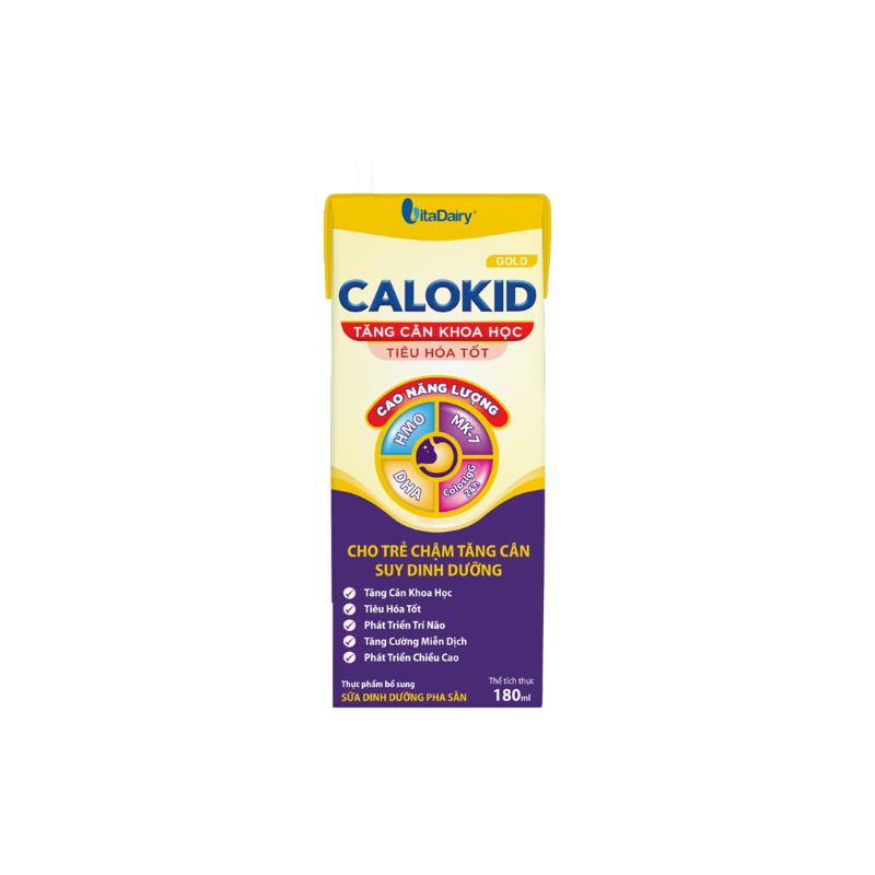 Calokid Gold – sản phẩm dinh dưỡng giàu năng lượng, Vitamin, Khoáng chất và hệ dưỡng chất bổ sung khoa học phù hợp với trẻ chậm tăng cân, biếng ăn, suy dinh dưỡng. Calokid Gold giúp trẻ tăng cân khoa học, hỗ trợ tiêu hóa và hấp thu tốt, đồng thời giúp phát triển trí não, chiều cao và tăng cường miễn dịch.